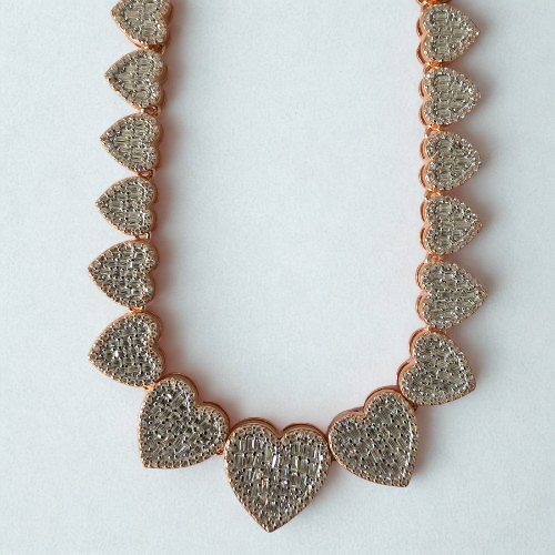 This enchanting heart-shaped tennis necklace is set in 14k rose gold plating, with each heart-shaped...