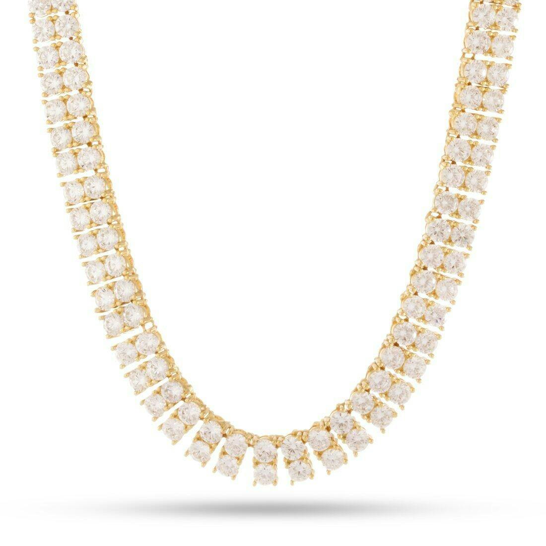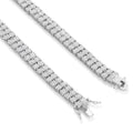 Providing a large, sophisticated look is this 8mm chain includes two-rows of clear, round-cut VVS Diamond Simulate stones that pop in light. Each stone comes placed on a prong setting for added security and durability and is available in 14K gold plating or white gold plating.