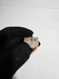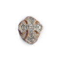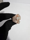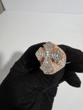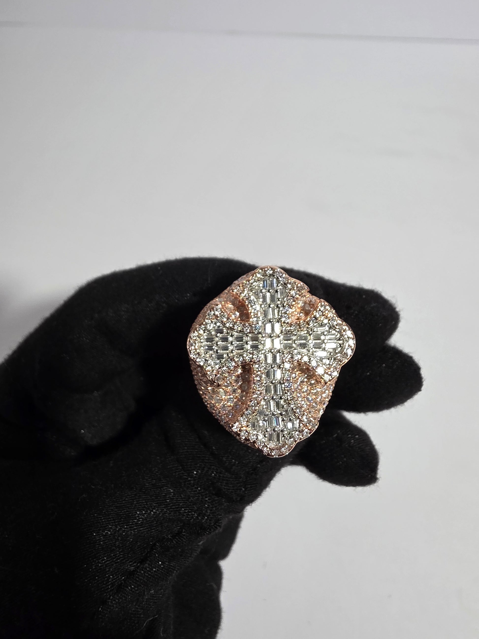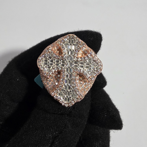 This stunning ring features a bold cross-shaped design, adorned with a combination of baguette and round-cut diamonds. Set in 14k rose gold-plated metal, the diamonds are arranged in a way that enhances their brilliance, creating a dazzling effect. The contrast of the warm rose gold with the sparkling diamonds gives the ring a luxurious and contemporary look, making it a perfect statement piece for special occasions or as a standout accessory for everyday wear.