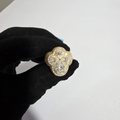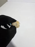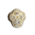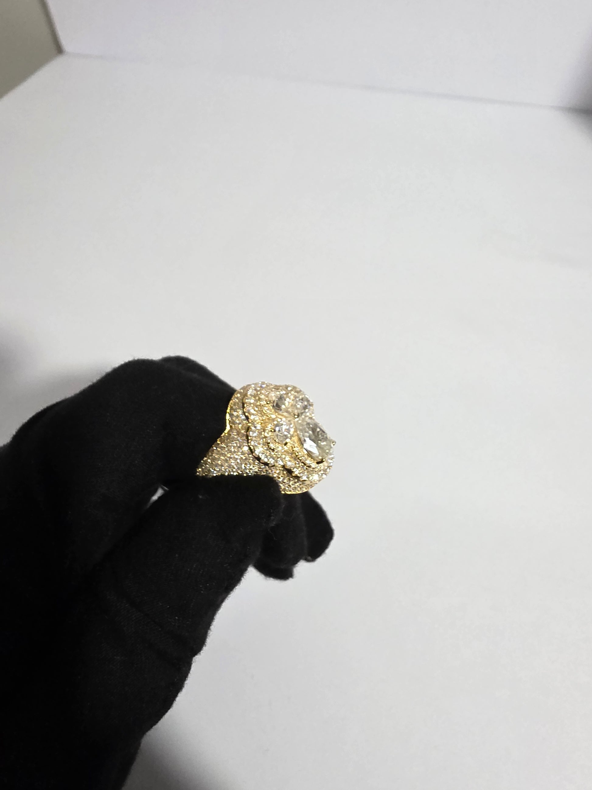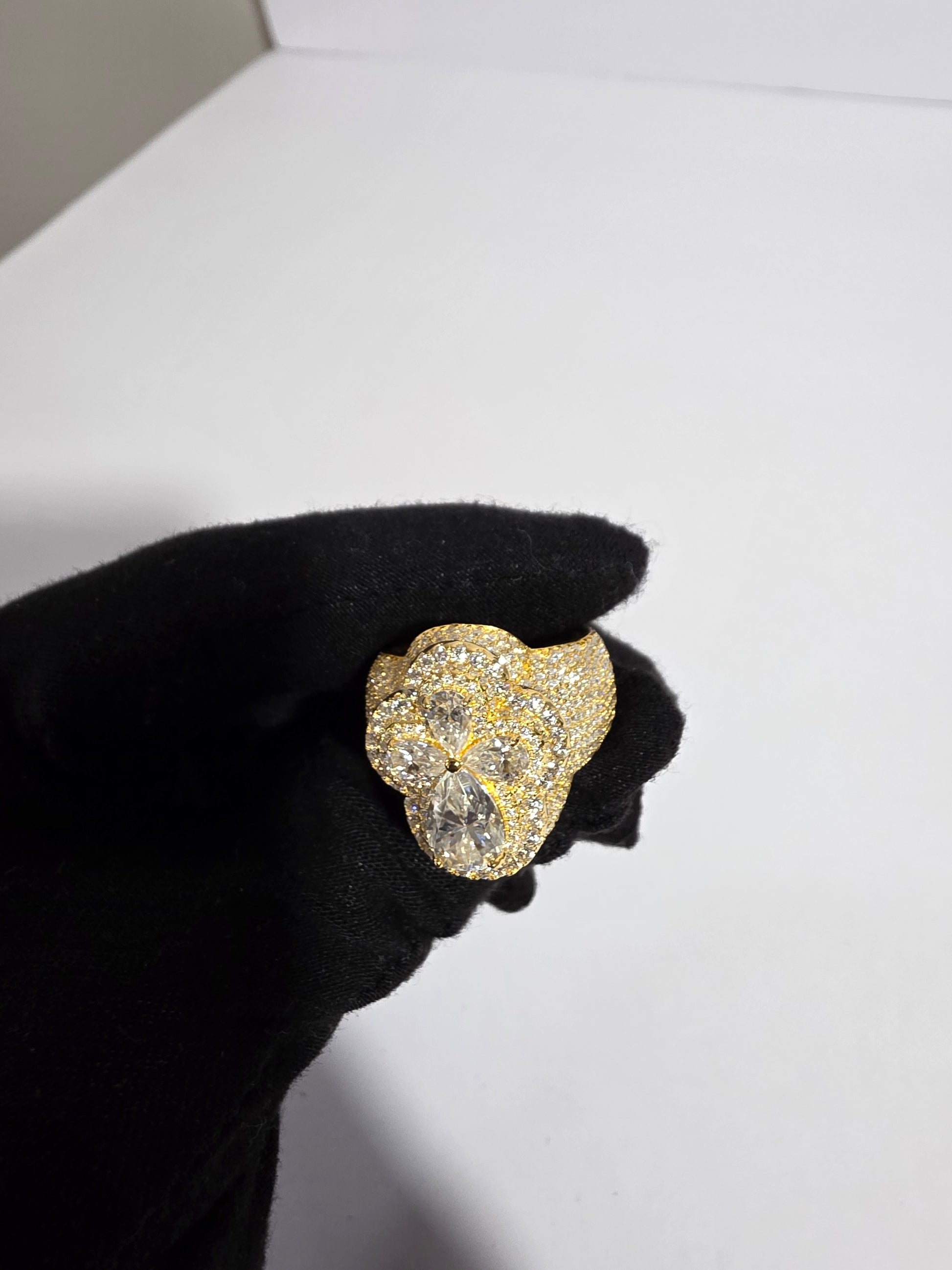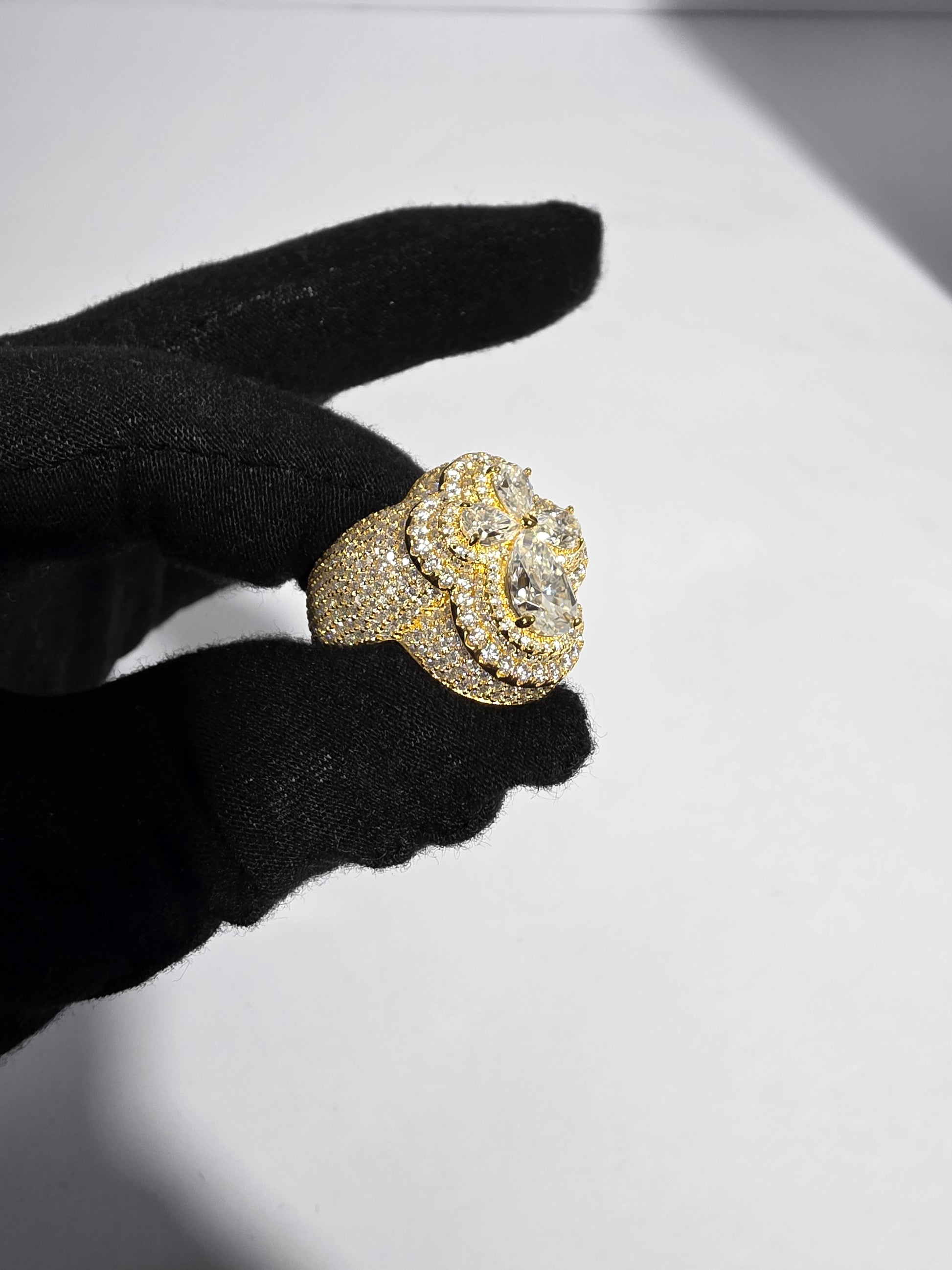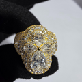 This stunning floral-shaped ring is set in 18k yellow gold-plated metal, featuring a striking combination of pear and round-shaped diamonds arranged to form a delicate flower. The central diamonds are large and eye-catching, while the surrounding pave diamonds add a dazzling effect. The warm yellow gold plating enhances the brilliance of the diamonds, making this ring a luxurious and sophisticated statement piece. Perfect for special occasions or as an elegant addition to your collection, this ring exudes glamour and timeless beauty.
