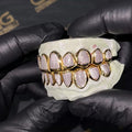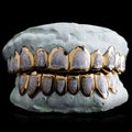 Cop these two-tone diamond dust grillz in solid gold. Shine in style with these white gold diamond dust grillz with yellow gold outline.