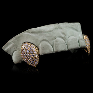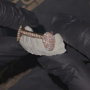 Give your teeth some love by wearing the fully iced out grillz on your canines and bridge bar. You get to decide and customize the style that you want and that's the beauty of this piece right here.